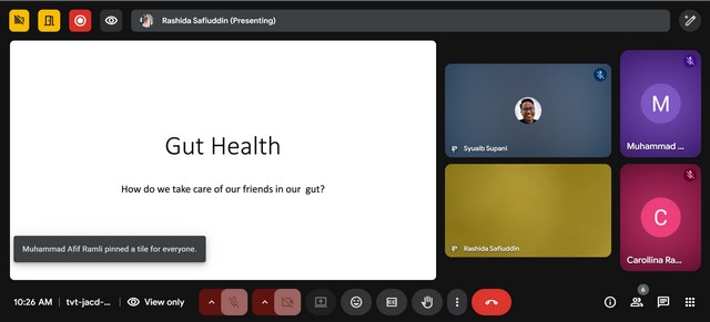 18 Oktober 2025 | Aktiviti TerkiniPada 17 Oktober 2025, program Gut Health: Kunci Badan Sihat – Tapi Ramai Tak Jaga Sampai Sakit telah berjaya dilaksanakan bagi memberi kesedaran kepada peserta tentang pentingnya penjagaan kesihatan usus sebagai asas kepada kesihatan tubuh badan secara keseluruhan. Melalui sesi perkongsian ilmu dan interaktif, peserta didedahkan kepada amalan pemakanan sihat, kepentingan probiotik serta kesan buruk gaya hidup tidak sihat terhadap sistem penghadaman. Program ini diharap dapat meningkatkan kesedaran masyarakat untuk menjaga kesihatan usus sejak awal demi mencegah penyakit dan mengekalkan kesejahteraan hidup.